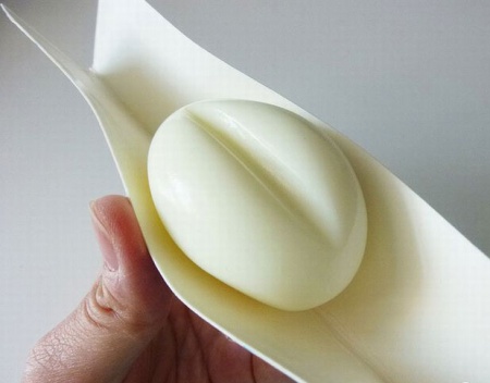 Почистить яйцо и не дожидаясь пока оно остынет, положить в сложенную бумагу и приматать резинками палочку, как показано на фото