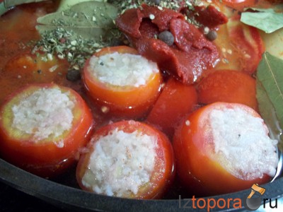 Все помидорчики друг на дружку укладываем в кастрюлю. Сверху заливаем водой и выкладываем весь жмых, который мы доставали из помидор. Также добавим томатную пасту, лавровый лист и душистый перец горошком. Приправим солью и специями. ![]() |